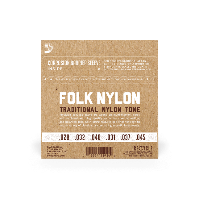 D’Addario Folk Nylon strings bring the alluring sound of nylon to all types of acoustic guitars. Folk Nylon sets feature ball ends, making them compatible with other, non-classical acoustic guitars. Combining silver-wound nylon core basses with clear nylon trebles, Folk Nylon guitar strings bring warm, mellow, nylon tone to any acoustic. This Normal Tension set is our best-selling tension, preferred for the balance of rich tone, comfortable feel, and dynamic projection.