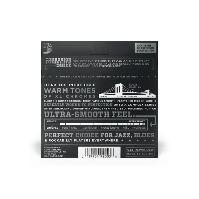 XL Chromes are our warmest, mellowest electric guitar strings. Beloved by jazz guitarists, as well as blues legends like Gary Clark Jr., these flat wound strings provide the smoothest feel and warmest tone, while allowing movement across the fretboard with no finger noise. Made with a high carbon steel core, Chromes’ stainless steel flattened ribbon wire is expertly wound onto a series of interlocking under-windings, then precisely polished for unparalleled smoothness and a sound which blends beautifully into any mix. 10-48 Extra Light is our lightest gauge of flatwound strings.