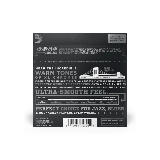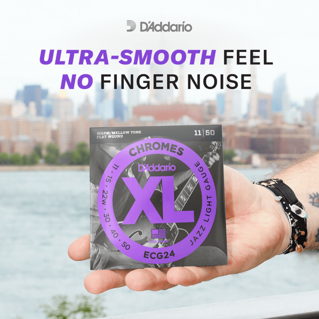 XL Chromes are our warmest, mellowest electric guitar strings. Beloved by jazz guitarists, as well as blues legends like Gary Clark Jr., these flat wound strings provide the smoothest feel and warmest tone, while allowing movement across the fretboard with no finger noise. Made with a high carbon steel core, Chromes’ stainless steel flattened ribbon wire is expertly wound onto a series of interlocking under-windings, then precisely polished for unparalleled smoothness and a sound which blends beautifully into any mix. This 12-52 Light set adds some additional tension over Jazz and Extra Light flat wound gauges, for a slightly fuller tone.