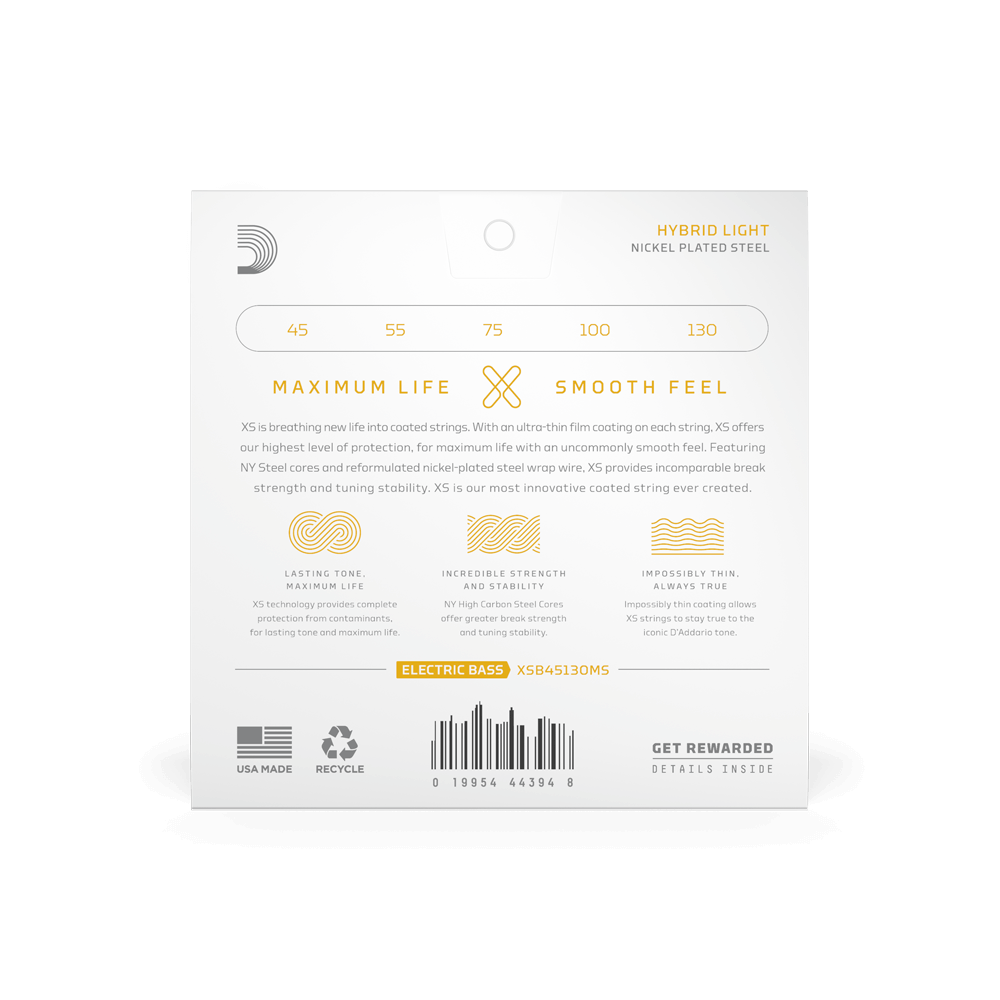 Inside each XS Nickel Electric Bass String is a NY High Carbon Steel Core — the same as you’ll find in your favorite D’Addario wound strings. This angular core provides the wrap wire with more surface area to grip, resulting in enhanced tone and intonation. Plus, D’Addario XS sets are far from your ordinary coated bass guitar strings. The entire set of bass guitar strings features groundbreaking thin film coatings that retain their clarity and resonance, even after numerous jam sessions. Because of this extra protection, dirt, debris, and sweat don’t penetrate between the string windings, blocking the major source of tone degradation.