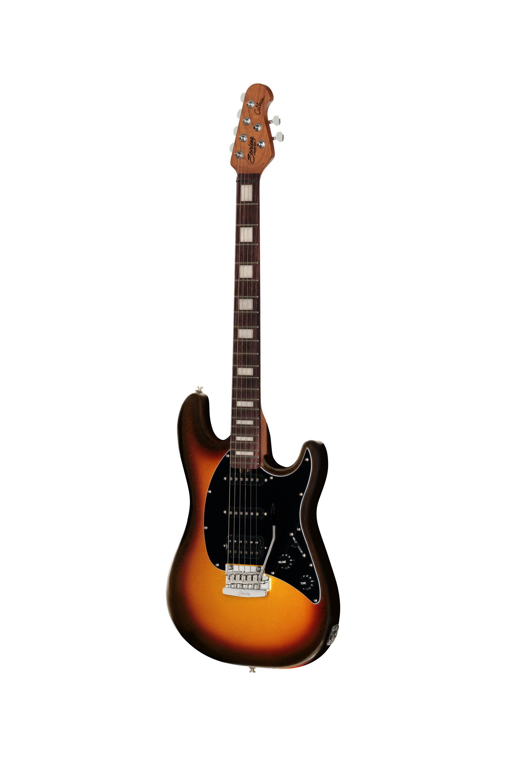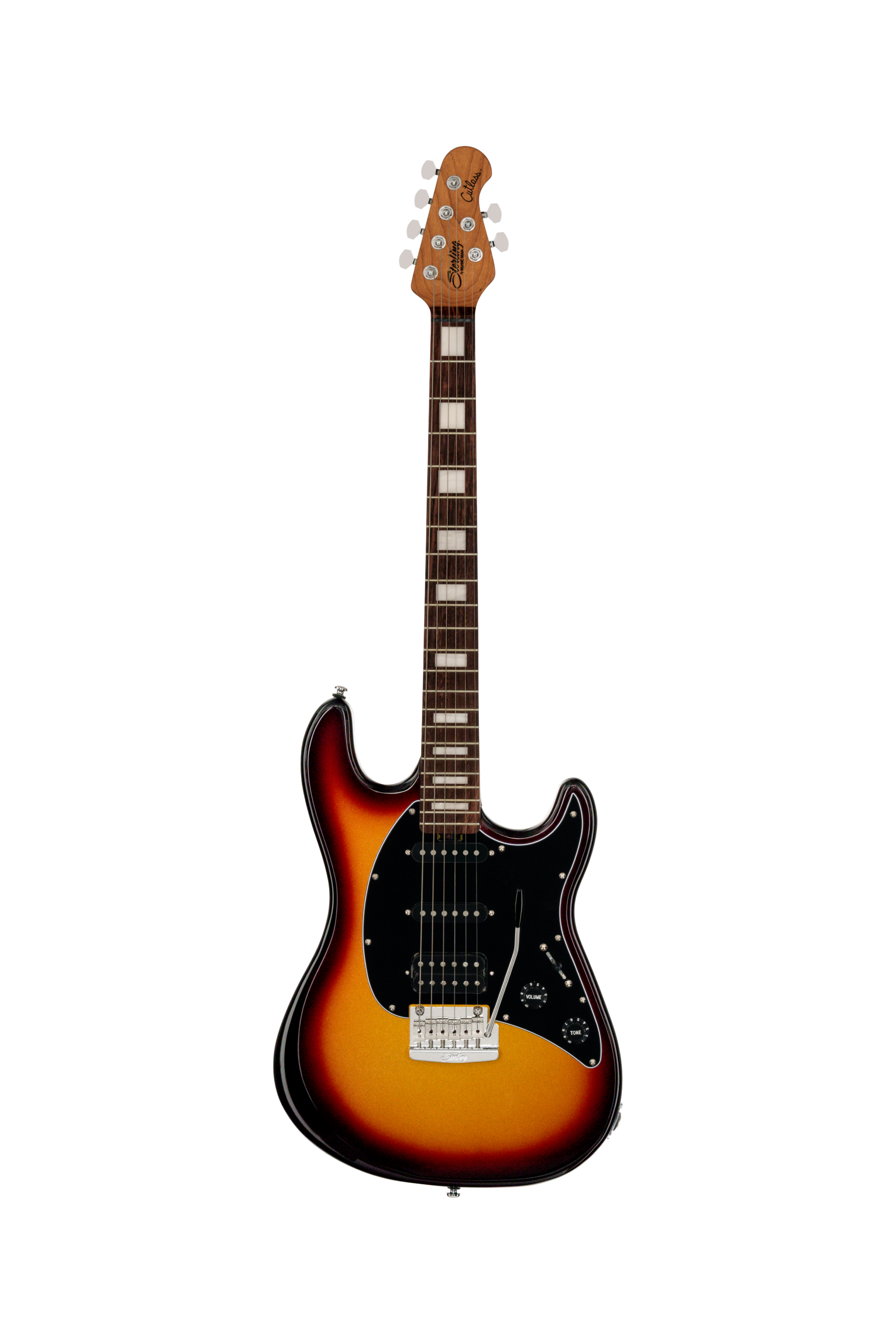 The Sterling by Music Man Cutlass CT50 Plus enhances the original Cutlass CT50HSS with powerful features that appeal to players. It features a 9V active circuit driving HSS-configured Modern pickups for high-output performance that cuts through mixes. The push-pull control on the master volume knob allows for mid-boost shaping, perfect for intensified riffs. With elegant pearloid block inlays on the 22-fret rosewood fingerboard, the CT50 Plus combines style and improved sound. It includes a roasted maple neck, lightweight poplar body, reliable locking tuners, and a vintage tremolo for smooth dips and dive-bombs. Get ready to elevate your playing with the Cutlass CT50 Plus!